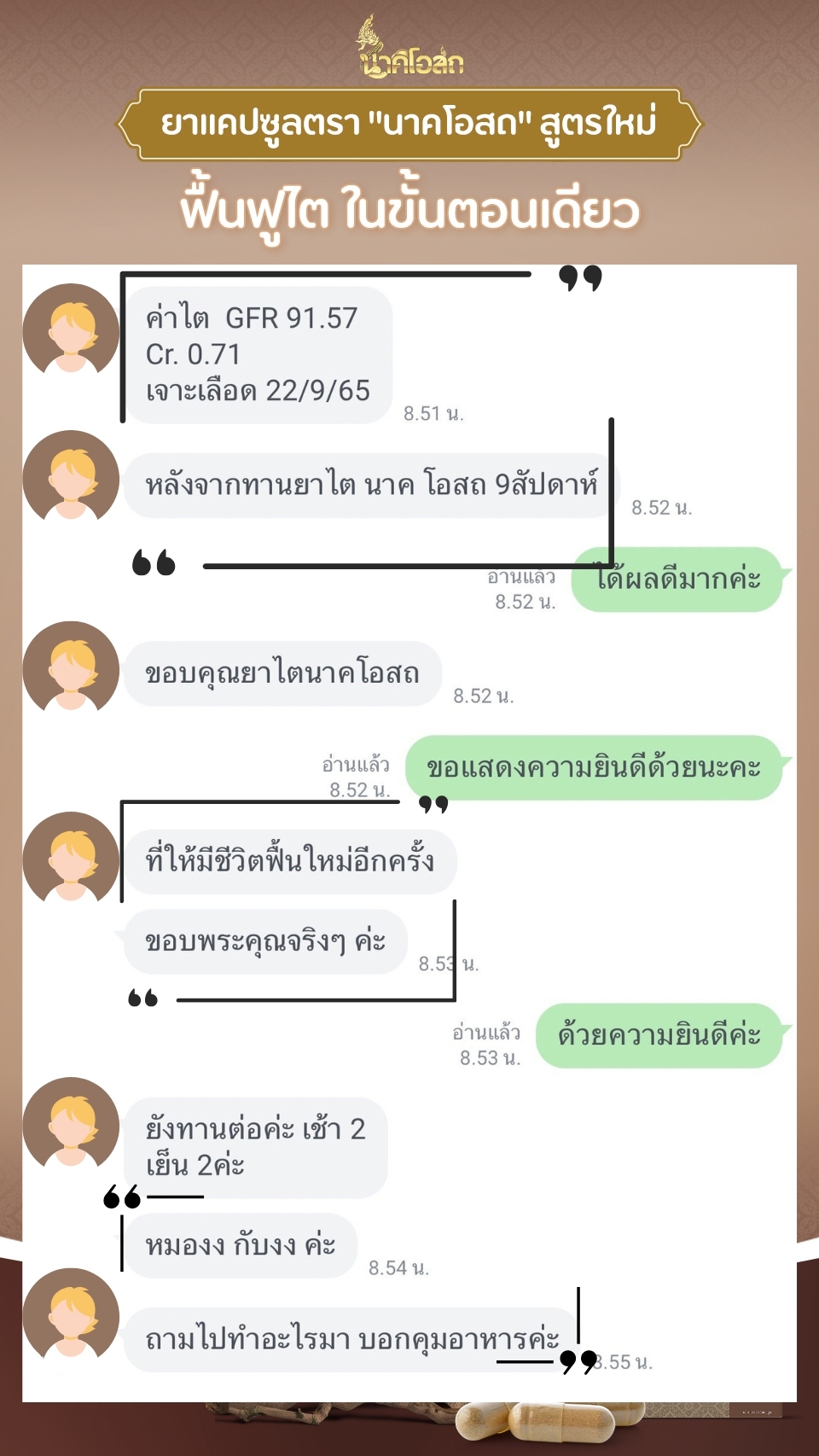 ผู้ป่วยระยะที่ 5 (ฟอกไต) : หลังจากทานยาทำให้ระยะการฟอกไต เริ่มห่างขึ้น นานขึ้น เช่น จาก 5 วันต่อสัปดาห์ เหลือเพียง 1-2 วันต่อสัปดาห์เท่านั้น คุณภาพชีวิตของคนไข้ดีขึ้น